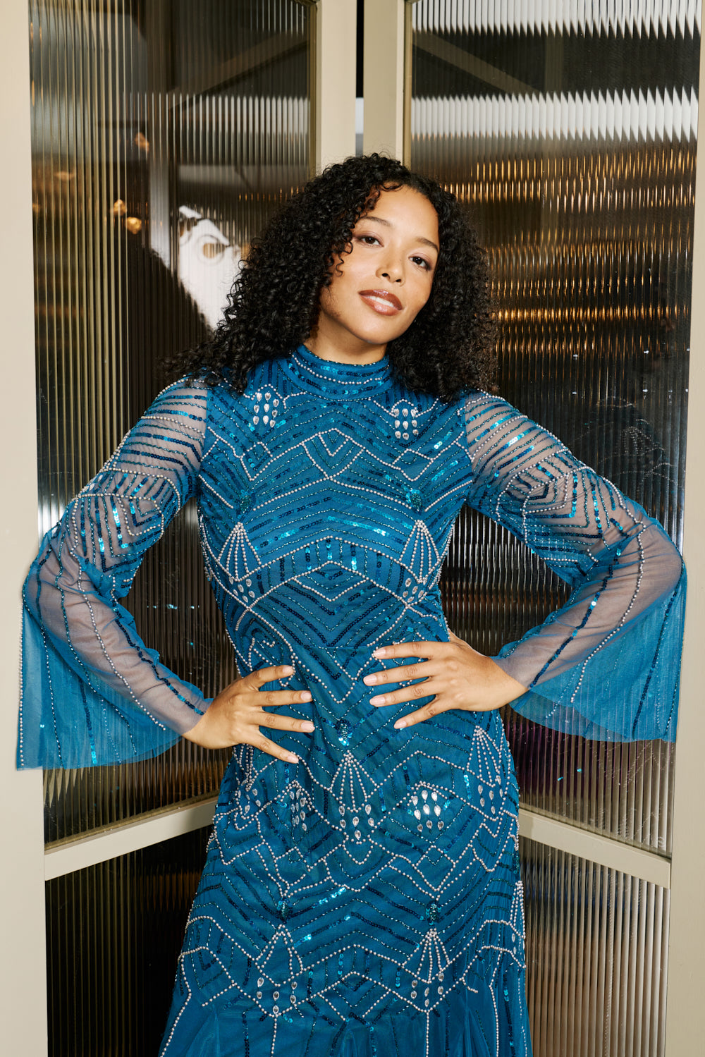 A vision in a vibrant blue hue, Adelia is the perfect party season plus one. Ornately embellished with sequins and beads in a vintage inspired motif, this full length gown is complete with long sleeves and a high neckline.